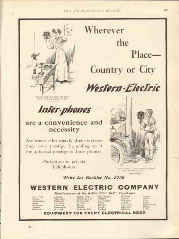 Original vintage architectural trade magazine ad for WESTERN ELECTRIC COMPANY. Wherever the Place, Country or City Western-Electric Inter Phones are a Convenience and Necessity. Perfection in Private Telephones. Old 1912 telephone industry advertisement.