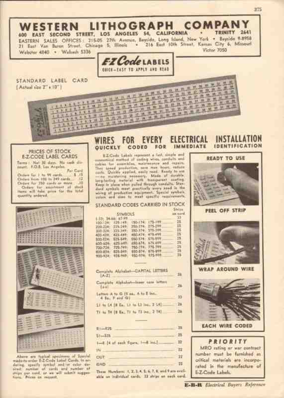Original electrical trade vintage catalog for WESTERN LITHOGRAPH COMPANY, was located at 600 East Second Street, Los Angeles, CA. Manufacturers of E-Z Code Labels, for every electrical installation, quickly coded for immediate identification. E-Z-Code labels represent a fast, simple and economical method of coding wire, conduits and cables for assemblies, maintenance and repairs. Disbound from a large 1944 electrical construction materials book, this unique old one page technical brochure would display wonderfully matted and framed. A marvelous addition to your retro electric equipment library.
