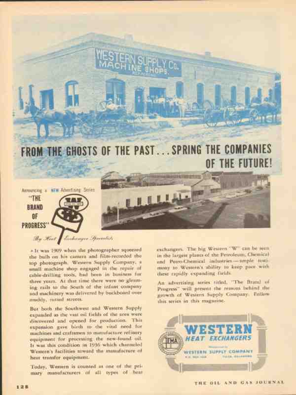 Original oil and gas trade magazine vintage ad for WESTERN SUPPLY COMPANY of Tulsa, OK. From the Ghosts of The Past Spring The Companies of The Future! Primary manufacturer of all types of Heat Exchangers. Unique 1953 old petroleum, chemical and petrochemical refining process industry equipment magazine advertisement.