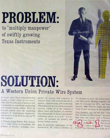 Original old telephone industry magazine vintage ad for WESTERN UNION of New York City, NY. Problem. To Multiply Manpower of Swiftly Growing Texas Instruments. Solution. Western Union Private Wire System. Due to scanner size limitation, full scan is not shown. This 1961 two-page gatefold magazine advertisement would display beautifully matted and framed.