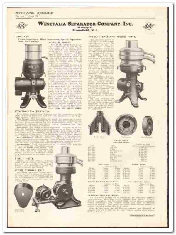 Original 1936 dairy trade vintage catalog for the WESTFALIA SEPARATOR COMPANY, INC. Main office and plant was located at 30 Orange Street, Bloomfield, NJ.