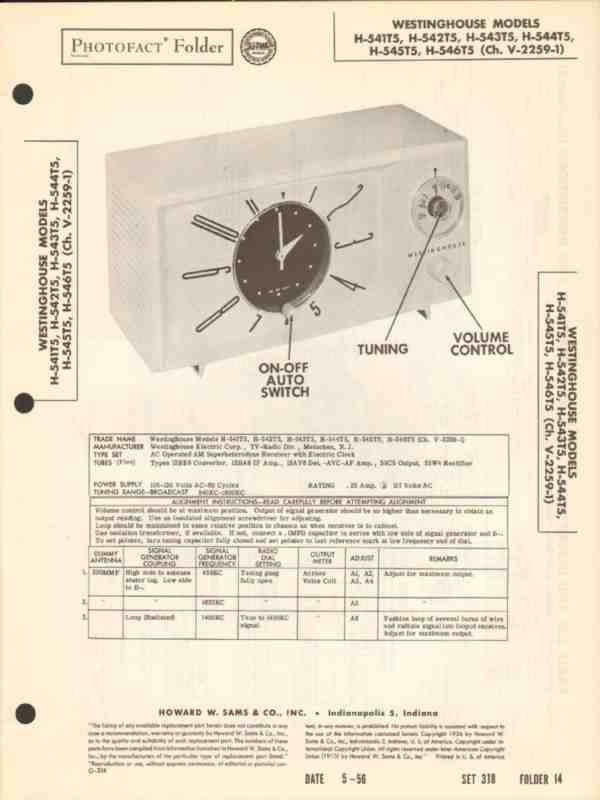 Vintage WESTINGHOUSE models H-541T5, H-542T5, H-543T5, H-544T5, H-545T5 and H546T5 (chassis V-2259-1) 5 tube Superheterodyne AM radio receiver with electric clock. Original old Sams Photofact manual includes schematic, layout, alignment instructions, voltage & resistance test chart, repair parts list and description. 4 pages. Dated 1956. This manual would make a sensational accompaniment to your classic radio equipment.