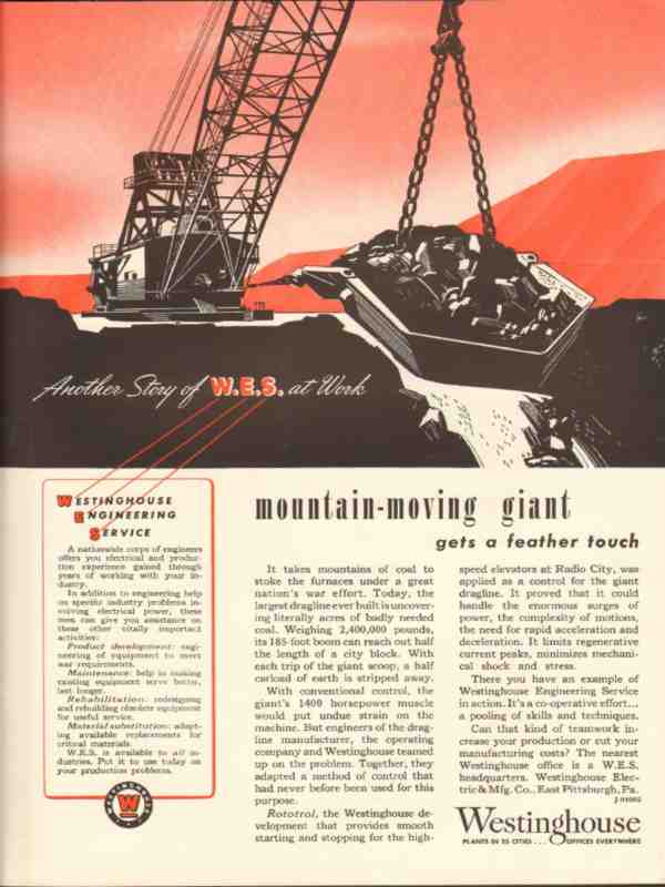 Original World War 2 engineering service industry trade magazine vintage ad for WESTINGHOUSE ELECTRIC AND MANUFACTURING COMPANY of East Pittsburgh, PA. Mountain Moving Giant Gets a Feather Touch. Rototrol, the Westinghouse development that provides smooth starting and stopping for the high speed elevators at Radio City, was applied as a control for the giant dragline. Old 1943 WW2 wartime era propaganda magazine advertisement.