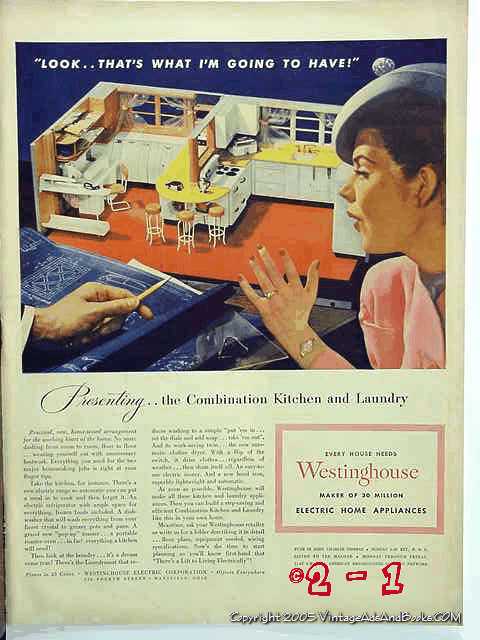 Original vintage magazine ad, WESTINGHOUSE ELECTRIC Home Appliances presenting the Combination Kitchen and Laundry. Old 1945 advertisement would look sensational matted and framed.
