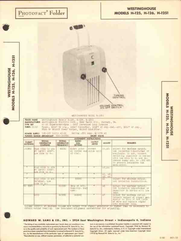 westinghouse model h-125 h-126 h-1251 am radio sams photofact manual