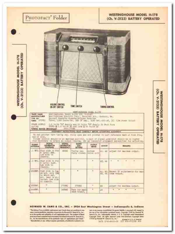 Vintage Radio Service Manual - WESTINGHOUSE model H-178 (Chassis No. V-2133) battery operated 5-tube Superheterodyne AM radio receiver. Manufactured by Westinghouse Electric Corp., of Sunbury, PA. Dated 1948. 4 pages. Original old Sams Photofact manual includes schematic, layout, alignment instructions, voltage & resistance test chart, repair parts list and description. This manual would make a sensational accompaniment to your retro audio equipment.