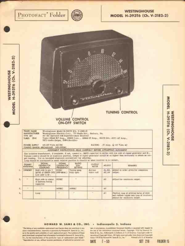 Vintage WESTINGHOUSE model H-393T6 (Ch. V-2182-2) 6 tube Superheterodyne AM radio receiver. Original old Sams Photofact manual includes schematic, layout, alignment instructions, voltage & resistance test chart, repair parts list. 4 pages. Dated 1953. Westinghouse Electric Corporation of Sunbury, PA. This manual would make a sensational accompaniment to your classic radio equipment.