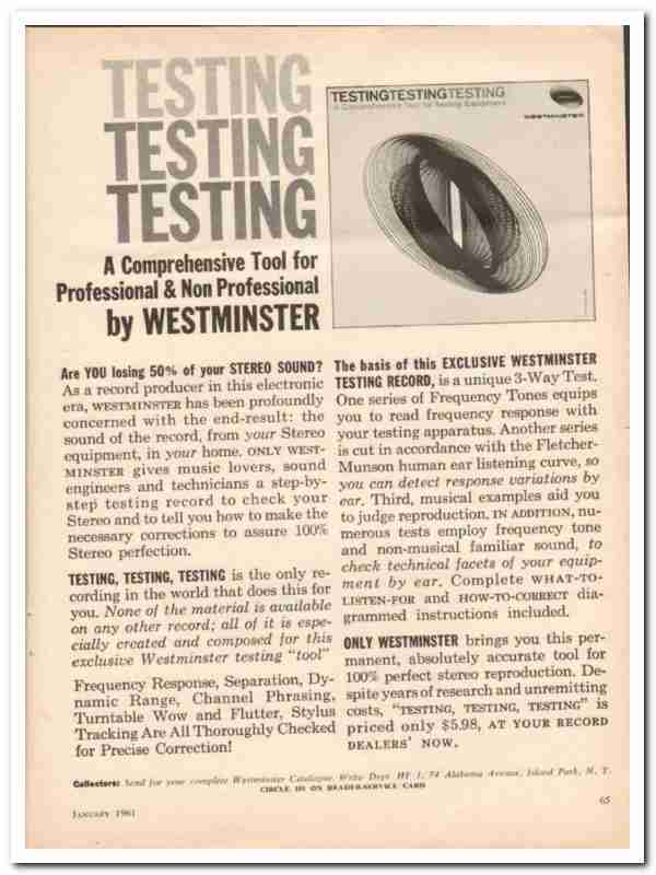 Original vintage ad for WESTMINISTER RECORDING COMPANY. Testing stereo equipment, a comprehensive tool for professional and non professional. Frequency response, separation, dynamic range, channel phrasing, turntable wow and flutter, stylus tracking are all thoroughly checked for precise correction. Found at your record dealers now.
