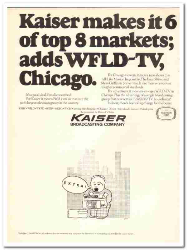 Original broadcast media vintage magazine ad for WFLD-TV Chicago, IL. Kaiser Broadcasting Company makes it six of top 8 markets. It's a good deal for all concerned. For Chicago viewers, it means new shows this fall like Mission Impossible, The Lucy Show and Merv Griffin in prime time. It also means new, even tougher commercial standards.