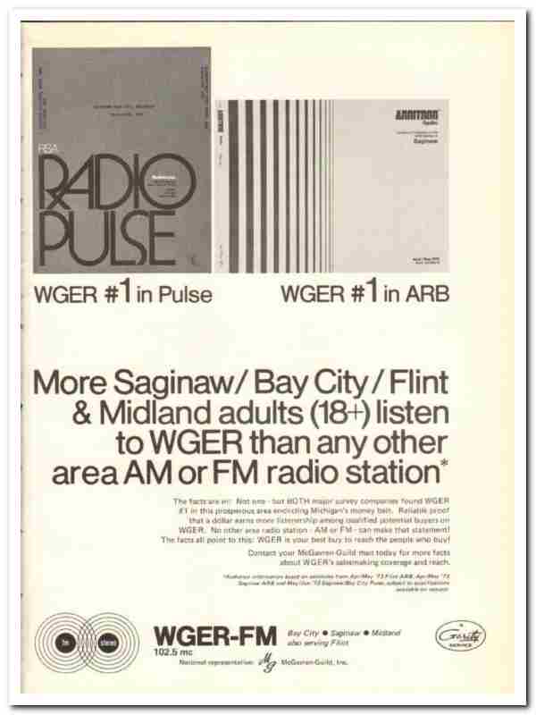 Original media vintage magazine ad for WGER-FM. Number 1 in Pulse and ARB with more Saginaw, Bay City, Flint and Midland adults listen than any other area AM or FM radio station. Reliable proof that a dollar earns more listenership among qualified potential buyers. Contact your McGavern-Guild man today for more facts about salesmaking coverage and reach.