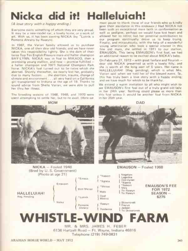 whistle-wind farm 1972 nicka emauson stud arabian horse vintage ad