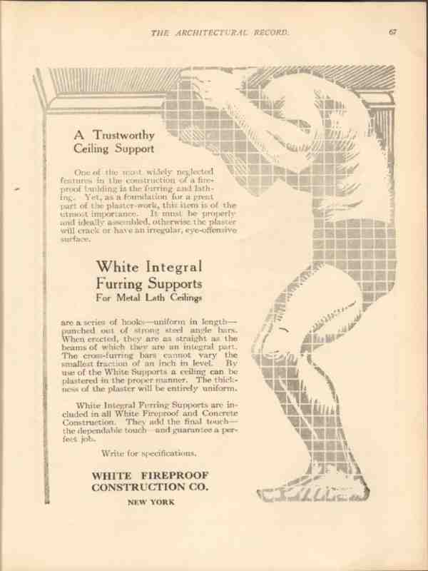 Original vintage architectural trade magazine ad for WHITE FIREPROOF CONSTRUCTION COMPANY of New York City, NY. Trustworthy Ceiling Support with White Integral Furring Supports for Metal Lath Ceilings. Old 1913 building construction industry advertisement.