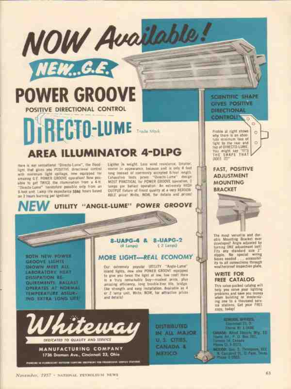 Original old retail petroleum trade magazine vintage ad for WHITEWAY MANUFACTURING COMPANY of Cincinnati, OH. GE Power Groove Flood-Lighting. Directo-Lume Area Illuminator 4-Dlpg. 8-UAPG-4, 8-UAPG-2. This unique 1957 gasoline service station advertisement would display beautifully matted and framed.