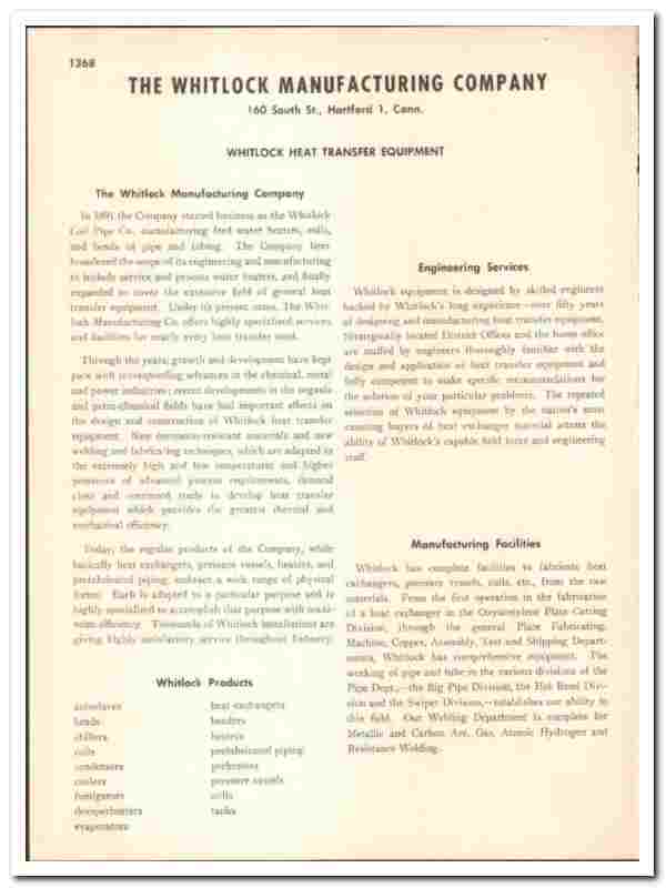 'In 1891, the Company started business as the Whitlock Coil Pipe Company, manufacturing feed water heaters, coils and bends of pipe and tubing. The Company later broadened the scope of its engineering and manufacturing to include service and process water heaters and finally expand to cover the extensive field of general heat transfer equipment. Under its present name, the Whitlock Manufacturing Company offers highly specialized services and facilities for nearly every heat transfer need'.