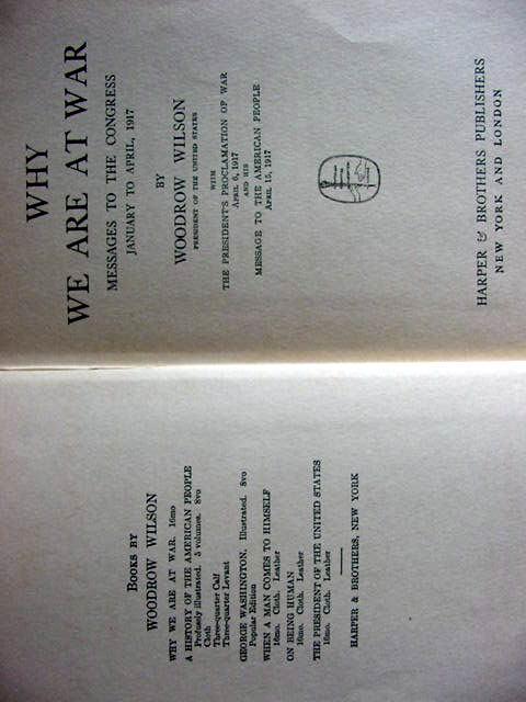 Hard covered book titled WHY WE ARE AT WAR by Woodrow Wilson, Printed May 1917. 79 pages.