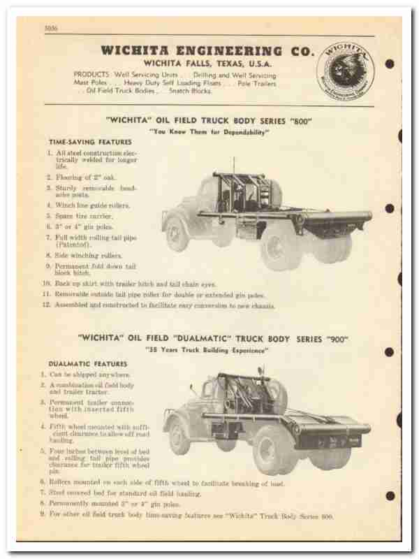 Products include Wichita Oil Field Truck Body Series 800, Wichita Oil Field Dualmatic Truck Body Series 900, Wichita Self Loading Float Trailers, Wichita Pole Trailers, Wichita Junior Model Winch, Wichita Telescopic Mast Poles, Wichita Patented Roller Units and Tandem Oil Field Truck Bodies Series 1800 are all featured.