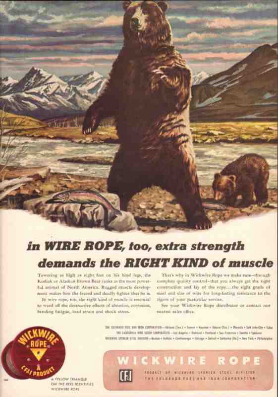 Original oil and gas trade magazine vintage ad for WICKWIRE SPENCER STEEL COMPANY. Extra Strength Demands the Right Kind of Muscle. Towering as high as 8 feet on his hind legs, the Kodiak or Alaskan Brown Bears ranks as the most powerful animal of North America. In wire rope, too, the right muscle is essential to ward off the destructive effects of abrasion, corrosion, bending fatigue, lad strain and shock stress. Art work by Woodi Ishmael. This unique 1953 old oilfield petroleum drilling industry equipment magazine advertisement would display beautifully matted and framed. Great graphics.