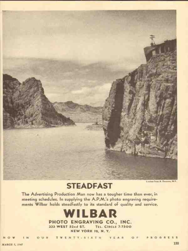 Original vintage advertising media trade magazine ad for WILBAR PHOTO ENGRAVING COMPANY, INC. of New York City, NY. Lindner from A. Devaney, NY. Steadfast. In Supplying the Advertising Production Man's photo engraving requirements Wilbar holds steadfastly to its standard of quality and service. Old 1947 magazine advertising industry advertisement, would display beautifully matted and framed.