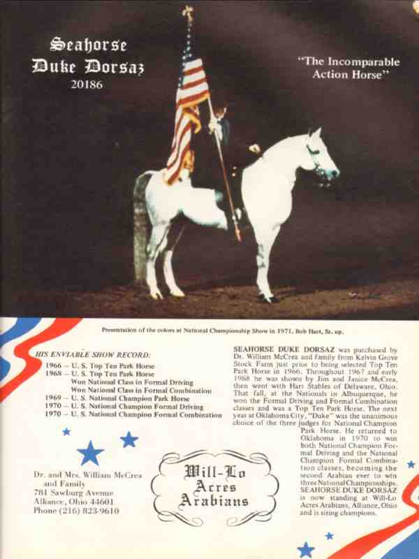 Will-Lo Acres Arabians 1972 Seahorse Duke Dorsaz stud horse vintage ad