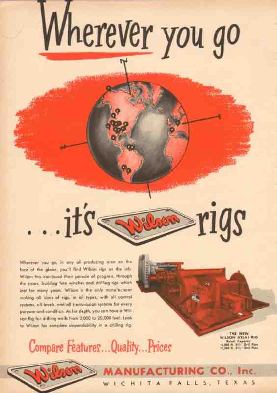 Original oil and gas trade magazine vintage ad for WILSON MANUFACTURING COMPANY, INC. of Wichita Falls, TX. Wherever oil producing areas are, you'll find Wilson rigs on the job. The only manufacturer making all sizes of rigs, in all types, controls systems, levels and transmission systems for every purpose and condition. This unique 1953 old oilfield petroleum drilling rig industry equipment magazine advertisement would display beautifully matted and framed.