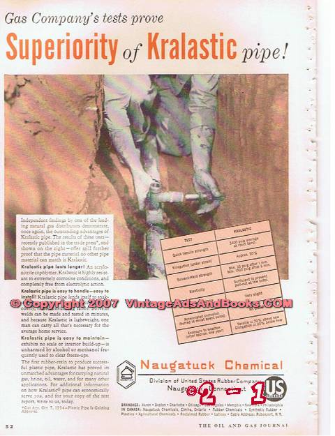 Original oil and gas trade magazine vintage ad for WILSON MANUFACTURING COMPANY, INC. of Wichita Falls, TX. Wilson is First Again! with the Slim Hole Rig That Really Counts. First name in Drilling Rigs. Pictured is the Wilson Mogul 42 Torcair Slim Hole Rig and Mogul 102' Manten Angle Steel Mast. The Home of Red Iron. Unique 1955 old oilfield petroleum drilling industry equipment magazine advertisement would display sensational matted and framed. On the reverse side is an ad for NAUGATUCK CHEMICAL of Naugatuck, CT. Division of United States Rubber Company. Gas Company's Tests Prove Superiority of Kralastic Pipe! Old 1955 petroleum petrochemical industry magazine advertisement. Approximate size 9 x 12 inches.