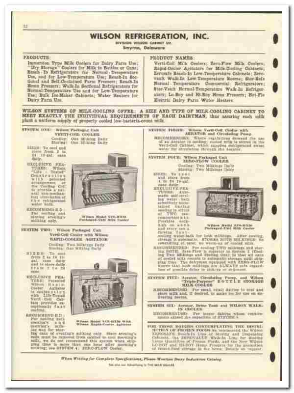 Products include the Wilson Packaged Unit Verti-Coil Cooler, Wilson Packaged Unit Verti-Coil Cooler with Wilson Rapid-Cooler Agitator, Wilson Verti-Coil Cooler with Agitator & Circulating Pump, Wilson Packaged Unit Zero-Flow Cooler, Aerator, Circulating Pump & Wilson 'Triple-Purpose' Bottle Storage Milk Cooler and Aerator, Brine Tank and Wilson Walk-In Cooler, all are fully featured.