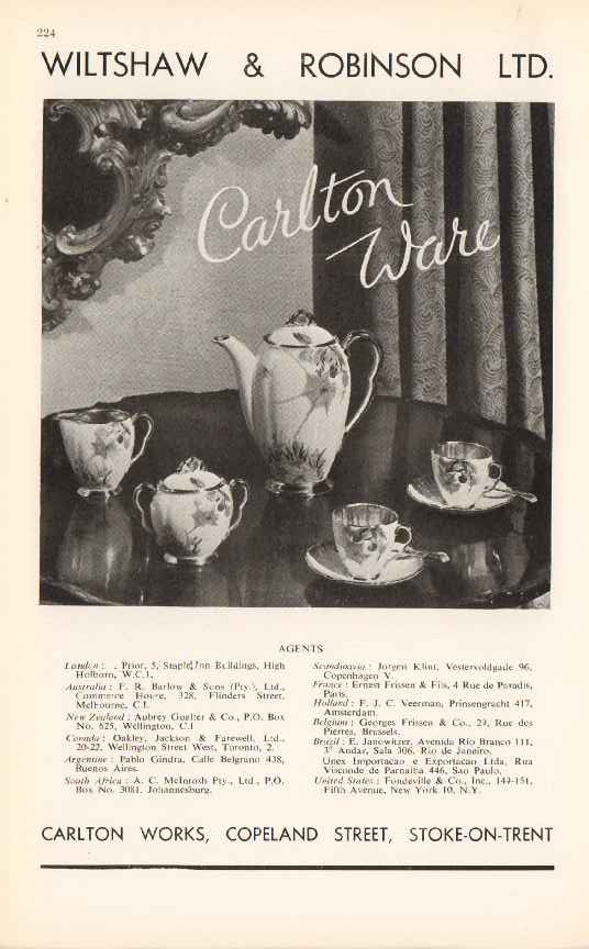 Original vintage ad for WILTSHAW AND ROBINSON LTD. Carlton Ware teaware and pottery manufactured. Pictured are cups, saucers, teapot, creamer, sugar dish. Agents include Fondeville and Company, E. Janoqwitzer, Ernest Frissen and Fils, Pablo Gindra, Aubrey Gualter, F. R Barlow and Sons.