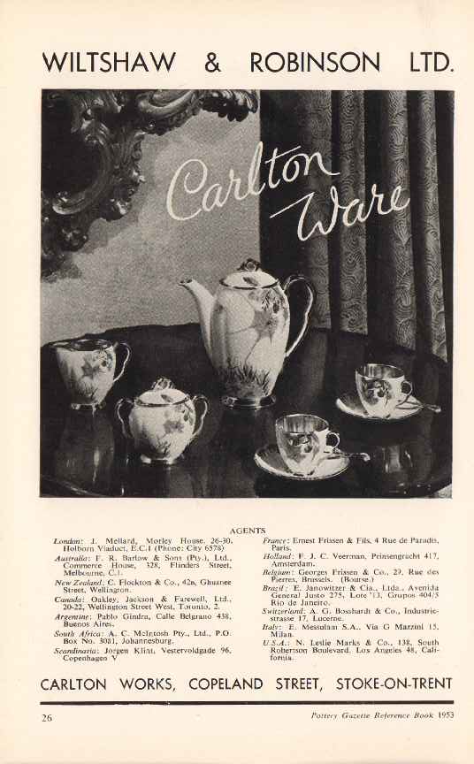 Original pottery vintage ad for WILTSHAW ROBINSON LTD. Elegant Carlton Ware teaware manufactured. Agents include J. Mellard, F.R. Barlow and Sons, C. Flockton and Company, Oakley, Jackson adn farewell, Pablo Gindra, A.C. McIntosh Pty, Jorgen Klint, Ernest Frissena dn Fils, F.J.C. Veerman, Georges Frissen and Co., E. Janowitzer and Cia, A.G. Bosshardt and Co., E. Messulam S.A., and N. Leslie Marks and Co.