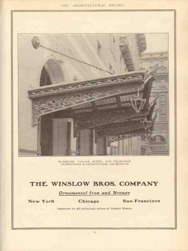 Original vintage architectural trade magazine ad for THE WINSLOW BROTHERS COMPANY of New York City, Chicago, and San Francisco. Marquis on the Palace Hotel in San Francisco, CA. Trowbridge and Livingstone, Architects. Ornamental Iron and Bronze. Old 1910 building and construction industry advertisement.