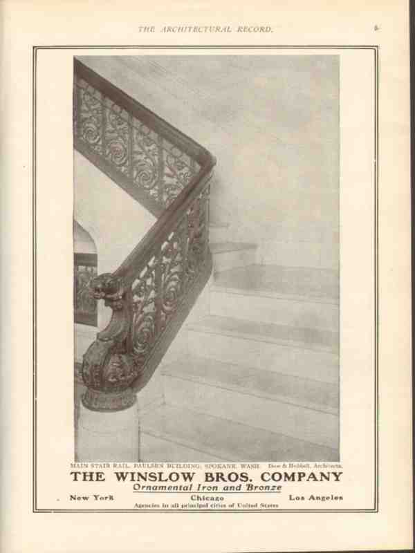 Original vintage architecture trade magazine ad for THE WINSLOW BROTHERS COMPANY of Chicago, IL, New York City, NY., and Los Angeles, CA. Picture is the Main Stair Rail, Paulsen Building in Spokane, WA. Dow & Hubbell, Architects. Ornamental Iron and Brass, Bronze and Iron. Old 1912 construction industry advertisement.