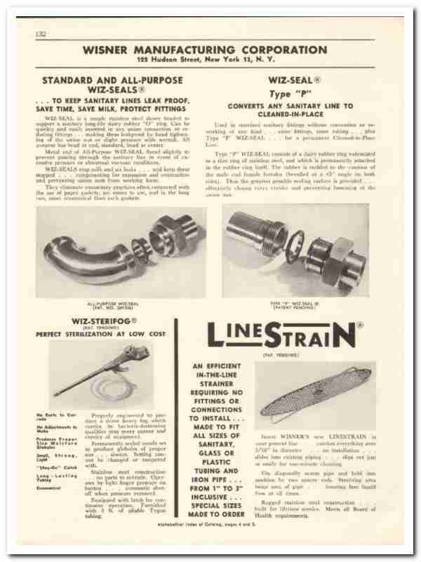 Manufacturers of Wiz-Seal. LineStrain. Products include Standard and All-Purpose Wiz-Seals to keep sanitary line leak proof, save time, save milk, protect fittings. Wiz-Seal Type P converts any sanitary line to cleaned-in-place, and LineStrain, an efficient in-the-line strainer requiring no fittings or connection to install. Has numerous product images with detailed descriptions, uses, applications and dimensions provided. Unbound from a large 1956 dairy industry catalog, this unique old one page technical brochure would display beautifully matted and framed. Nice cover graphics. A fantastic addition to your vintage dairy equipment library.