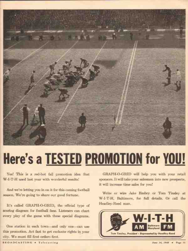 Original old radio TV broadcast trade magazine vintage ad for WITH of Baltimore, MD. AM and FM Radio Station. Here's a Tested Promotion for You. Graph-O-Grid, the official type of scoring diagram for football fans. Write Jake Embry or Tom Tinsley for details. This unique 1948 broadcasting advertisement would display beautifully matted and framed.