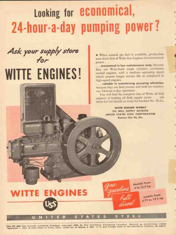 Original oil and gas trade magazine vintage ad for WITTE ENGINE WORKS of Kansas City, MO. Oil Well Supply Division of United States Steel Corporation. Looking for Economical, 24 Hour-a-Day Pumping Power? Ask for Witte Engines! This unique 1953 old oilfield petroleum pumping power industry equipment magazine advertisement would display fantastic matted and framed.