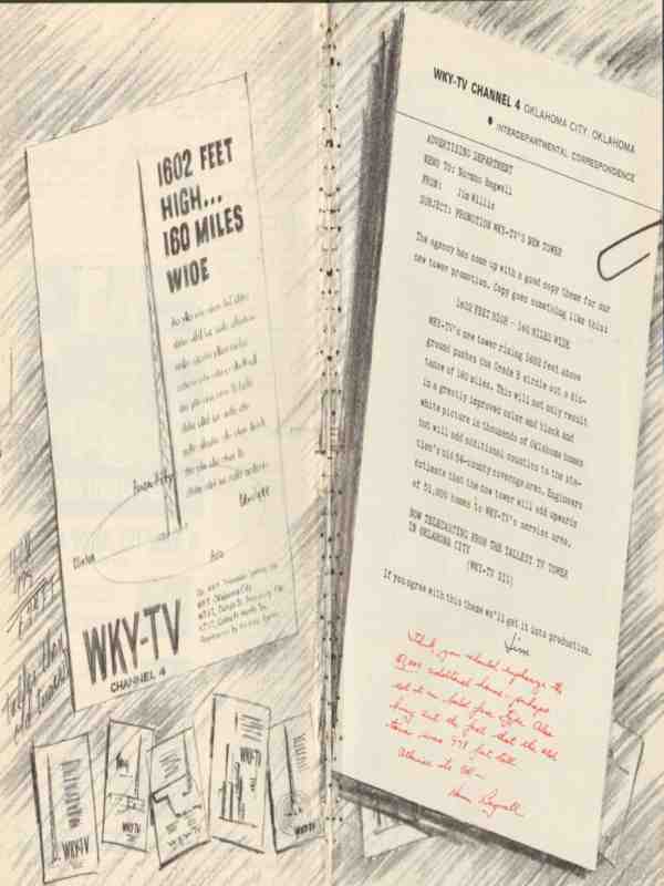 Original vintage broadcasting trade magazine ad for WKY TV Channel 4 of Oklahoma City, OK. New tower Rising 1602 Feet High pushes the Grade B Circle Out a Distance of 160 Miles. Now Telecasting From the Tallest TV Tower in Oklahoma City. WKY-TV. Memo to Norman Bagwell From Jim Willis. Old 1965 2-page gatefold television broadcasting industry advertisement.