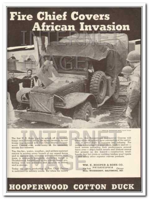 Original World War 2 business industry trade magazine vintage ad for WM. E. HOOPER AND SONS COMPANY of Philadelphia, PA. Fire Chief Covers African Invasion. Hooperwood Canvas mobilized for military needs. Photo by International News Sound. Old 1943 WW2 wartime era propaganda magazine advertisement.