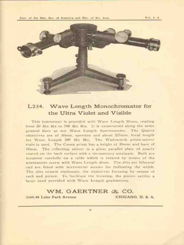 Original vintage optical industry trade magazine ad for WM. GAERTNER & COMPANY of Chicago, IL. L234 Wave Length Monochromator for the Ultra Violet and Visible . Has a Wave Length Drum. Old 1923 laboratory equipment advertisement.