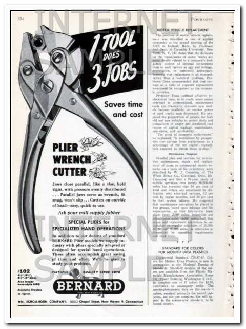 Original vintage industrial magazine ad for WM. SCHOLLHORN COMPANY of New Haven, CT. Plier Wrench Cutter. 1 Tool Does 3 Jobs. Special Pliers for Specialized Hand Operations. Old 1948 fractional page hand tool industry advertisement. Would display magnificently matted and framed!
