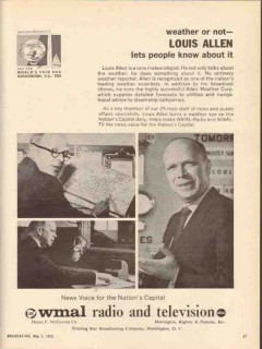 Original vintage broadcasting trade magazine ad for WMAL-TV of Washington, DC. Weather or Not, Louis Allen Lets People Know About It. No ordinary weather reporter, Allen is recognized as one of the nation's leading weather scientists. In addition to his broadcast chores, he runs the highly successful Allen Weather Corporation. Louis Allen turns a weather eye on the Nation's Capital daily, and helps make WMAL Radio and WMAL TV the News Voice for the Nation's Capital. Old 1965 broadcasting industry advertisement.