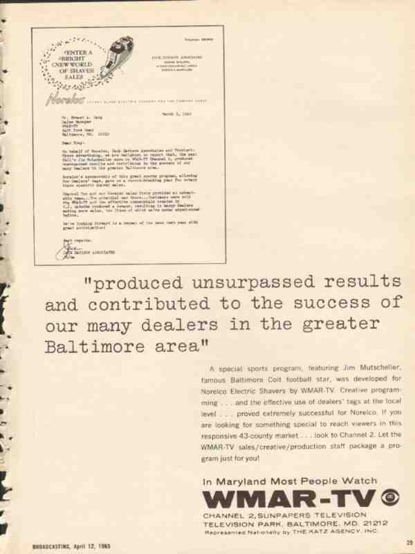 Original vintage broadcasting trade magazine ad for WMAR-TV Channel 2 of Baltimore, MD. A special sports program featuring Jim Mutscheller, famous Baltimore Colt football star, was developed for Norelco Electric Shavers by WMAR TV. Creative programming and effective use of dealers' tags at the local level proved extremely successful for Norelco. Letter to Mr. Ernest A. Lang, Sales Manager for WMAR from Jack Davison Associates. Old 1965 television broadcasting industry advertisement.