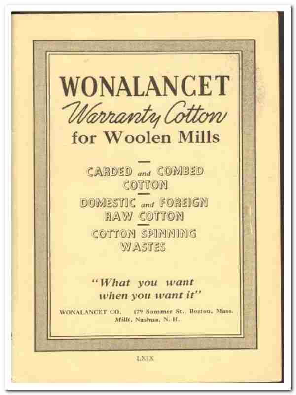 Original 1938 textile trade vintage ad for WONALANCET COMPANY. Main office was located at 179 Summer Street, Boston, MA. Mills were located in Nashua, NH.