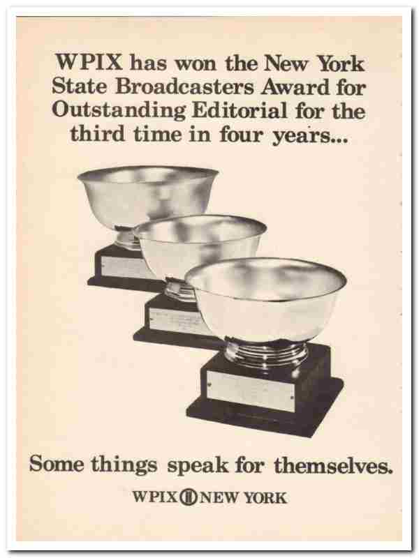 Original media vintage magazine ad for WPIX. New York State Broadcasters Award winner for Outstanding television Editorial. Third time in four years. Some things speak for themselves.