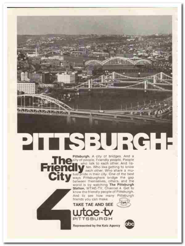 Original broadcasting media vintage magazine ad for WTAE-TV. Pittsburgh, PA. The Friendly City. A city of bridges and people, who talk to each other, and listen. Who like getting to know each other. Watch Channel 4. See how many fiends you can make. Take TAE and see. Represented by the Katz Agency.