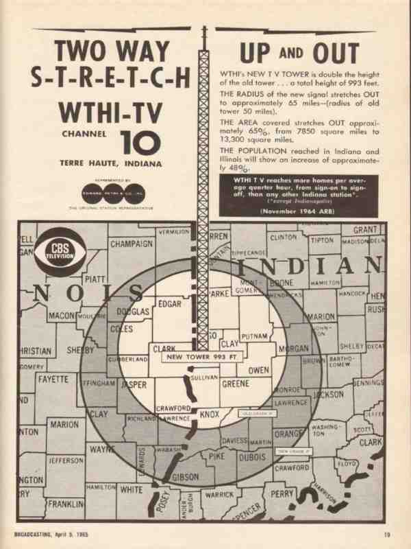Original vintage broadcasting trade magazine ad for WTHI-TV Channel 10 of Terre Haute, IN. Two Way Stretch Up and Out. New TV Tower double the height and the signal stretch out 65 miles. Old 1965 CBS television broadcasting industry equipment advertisement.