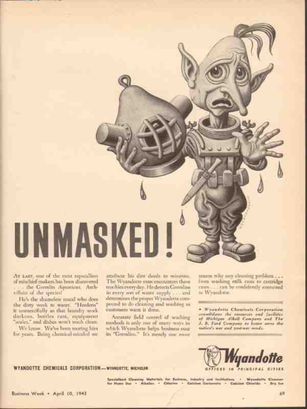 Original World War 2 military industry trade magazine vintage ad for WYANDOTTE CHEMICALS CORPORATION of Wyandotte, MI. Unmasked! One of the most rapscallion of mischief makers has been discovered, the Gremlin Aquaticus. He's the rascal who does the dirty work to water. Hardens it unmercifully. Art by Boris Artzbasheff. Old 1943 WW2 wartime era propaganda magazine advertisement.