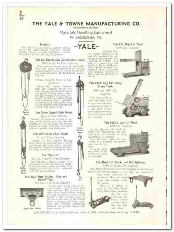 Original 1939 industrial trade vintage catalog for the YALE & TOWNE MANUFACTURING COMPANY. (Philadelphia Division). Main office and plant were located in Philadelphia, PA.