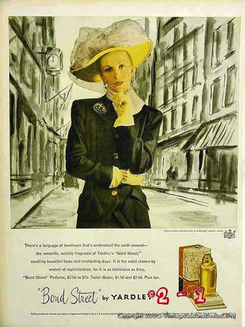 Original vintage magazine ad, YARDLEY Bond Street by appointment Perfumers to H.M. Queen Mary, Yardley, London. Old 1947 perfume advertisement.