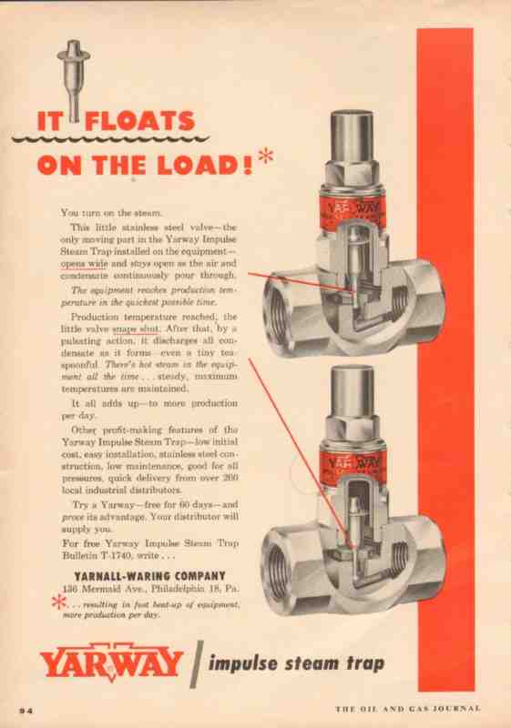 Original oil and gas trade magazine vintage ad for YARNALL WARING COMPANY, was located at 136 Mermaid Avenue, Philadelphia, PA. Yarway Floats on the Load! Impulse Steam Trap only moving part is the stainless steel valve. This unique 1953 old petroleum refinery and process industry equipment magazine advertisement would display beautifully matted and framed.