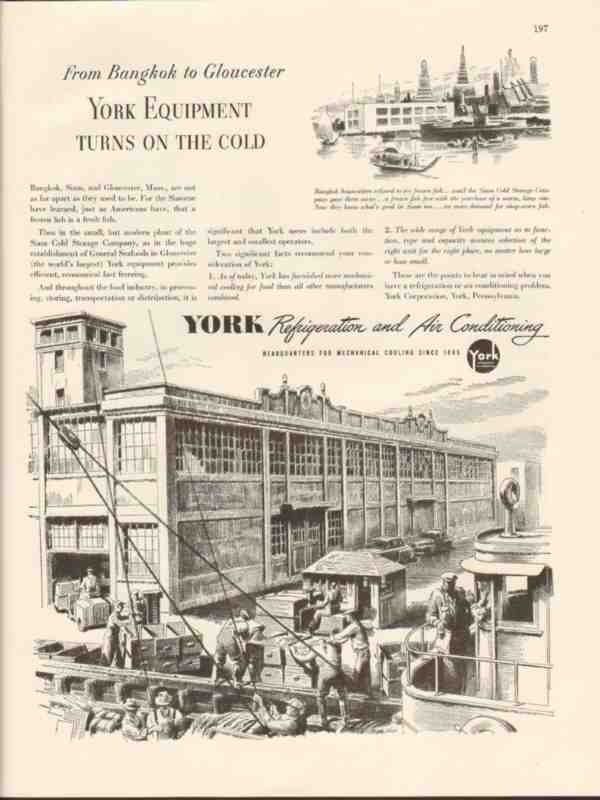 Original old refrigeration and air conditioning equipment trade magazine ad for YORK CORPORATION of York, PA. From Bangkok to Gloucester York Equipment Turns on the Cold. Bangkok housewives refused to try frozen fish until the Siam Cold Storage Company gave them away. York Refrigeration and Air Conditioning. This 1947 magazine advertisement would display beautifully matted and framed.