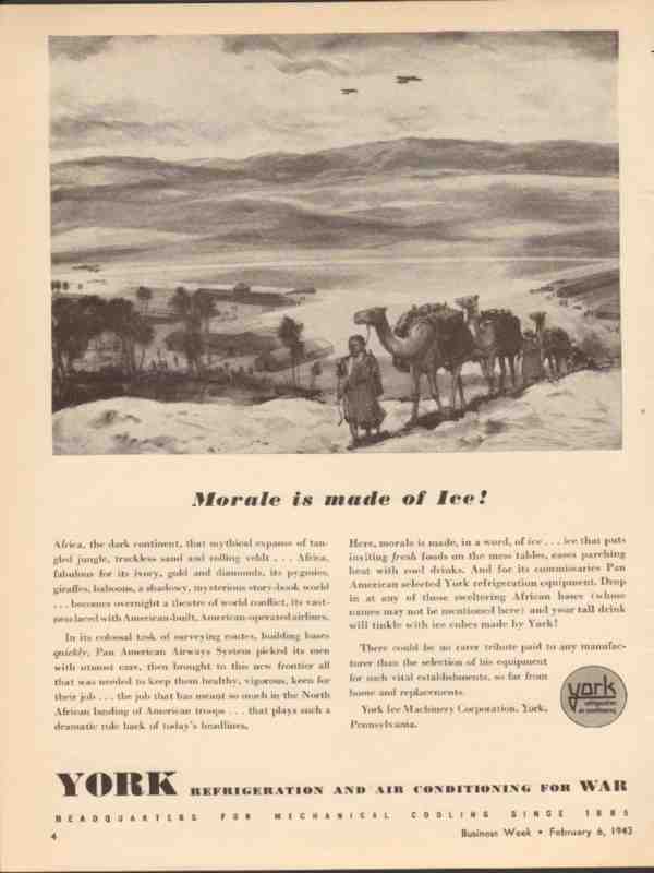 Original World War 2 refrigeration and air conditioning industry trade magazine vintage ad for YORK ICE MACHINERY CORPORATION of York, PA. Morale is Made of Ice! Ice that puts inviting fresh foods of the mess tables, eases parching heat with cool drinks. Pan American selected York refrigeration equipment. Old 1943 WW2 wartime era propaganda magazine advertisement.