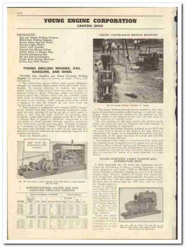 Products include Young Drilling Engines of Gas, Gasoline & Diesel, Young Electric Light Plants and Generator Sets, all fully featured.